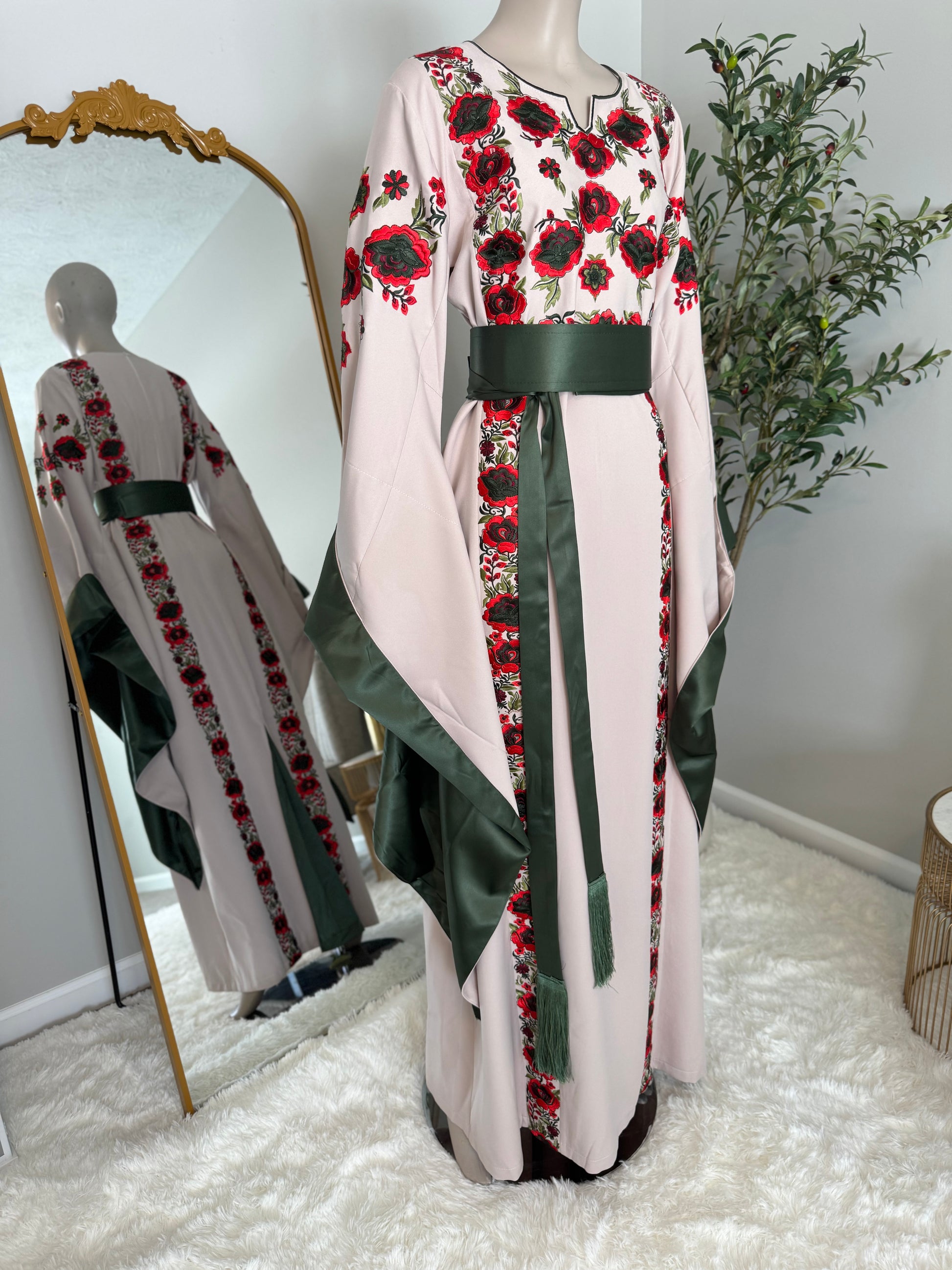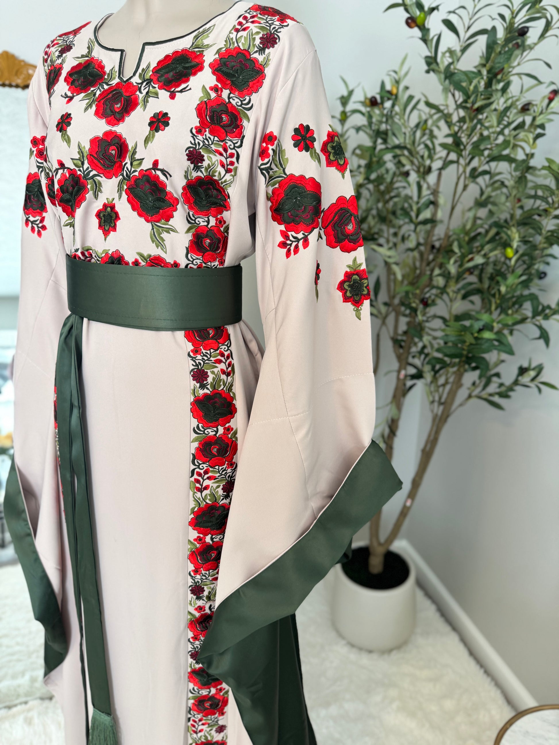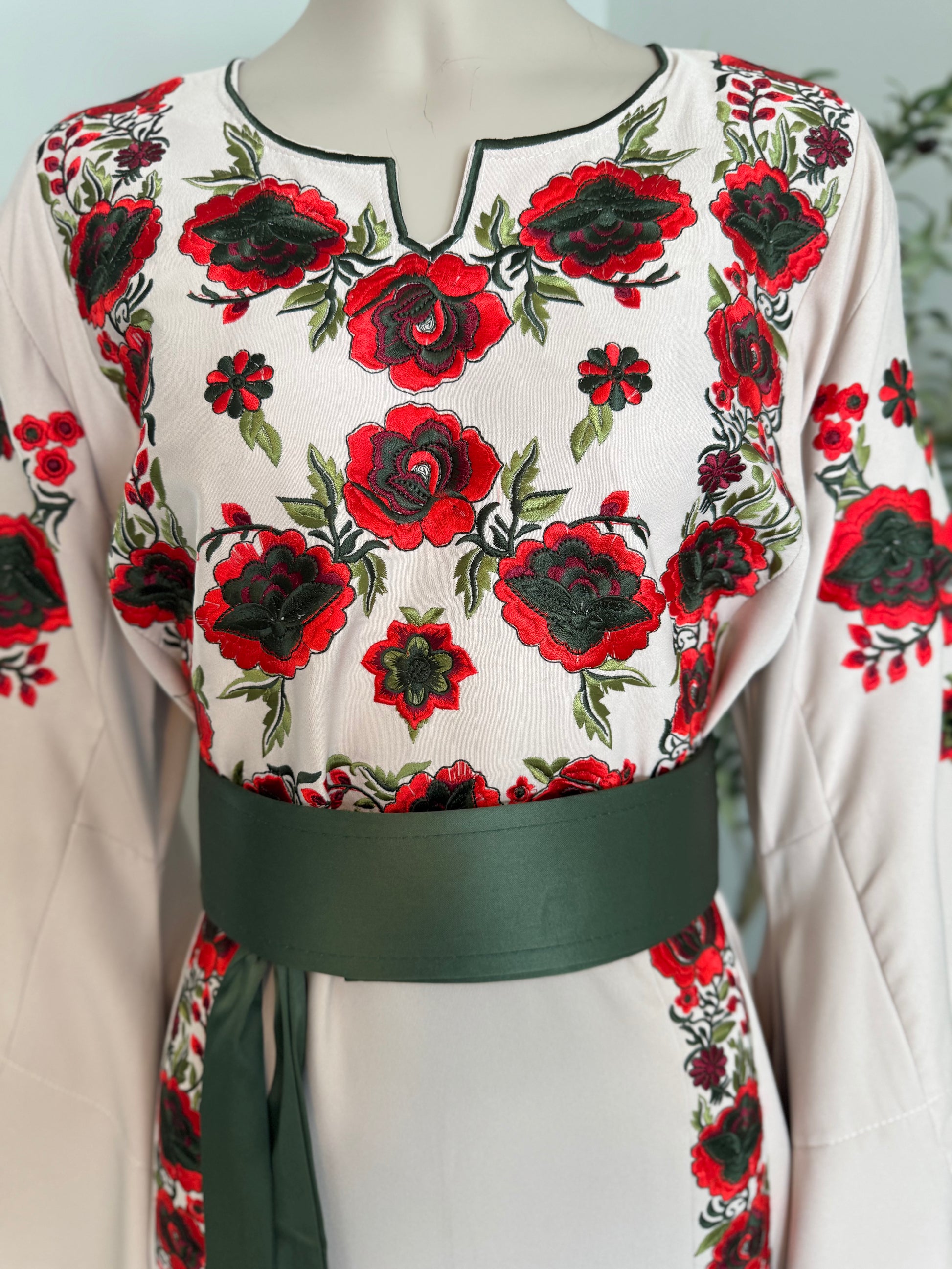 Beige thobe with colorful embroidery, in red, green, burnt burgundy, and olive green. Comes with a long satin and belt, embroidered on both front and back.