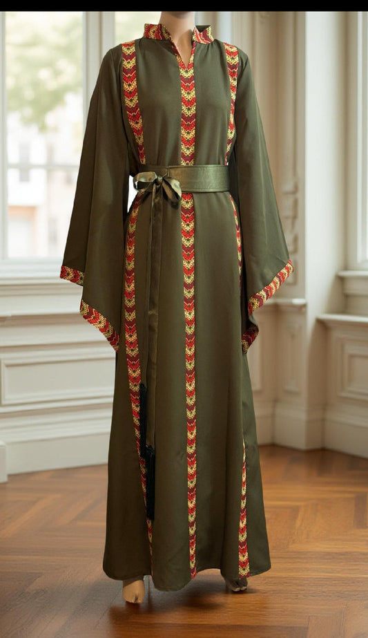 Olive green embroidered dress with satin belt