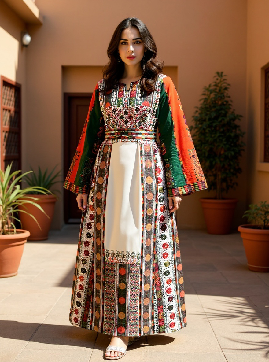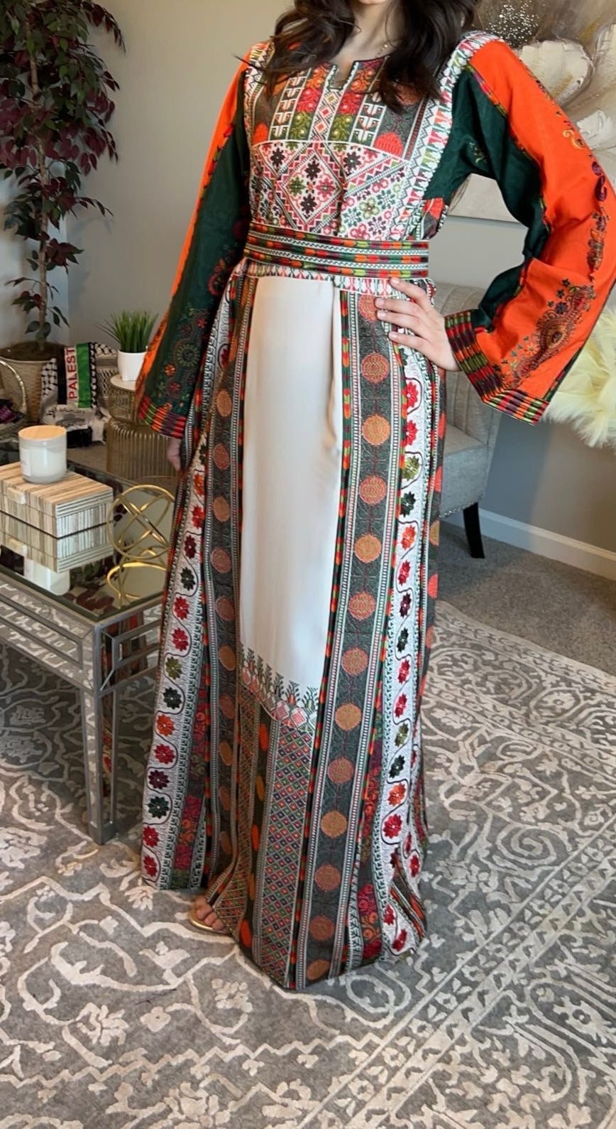 Beautiful beige thobe with green and orange sleeves, belt included.