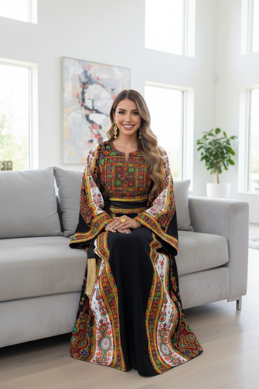 Black thobe with white embroidered fabric on the sides and sleeves; includes a belt and scarf.
