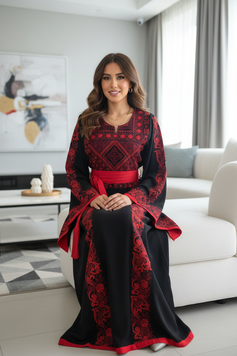 Elegant black and red thobe with matching satin belt