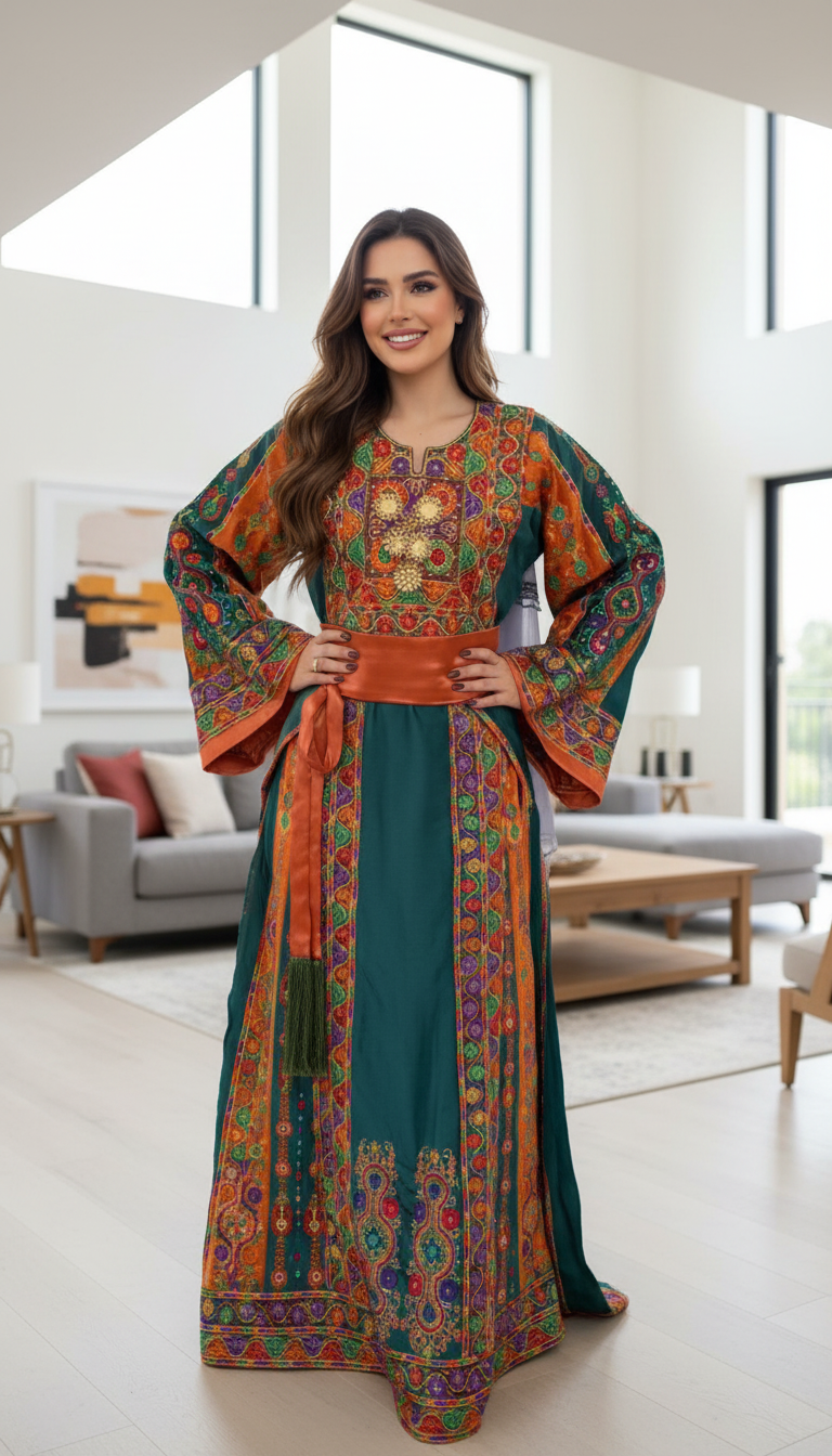 Custom sizes: green and orange, like a thobe, with matching scarf and belt.