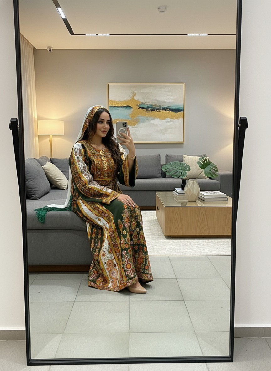 Olive green fabric thobe with white fabric on the sides and sleeves, a reversible belt, and scarf included.