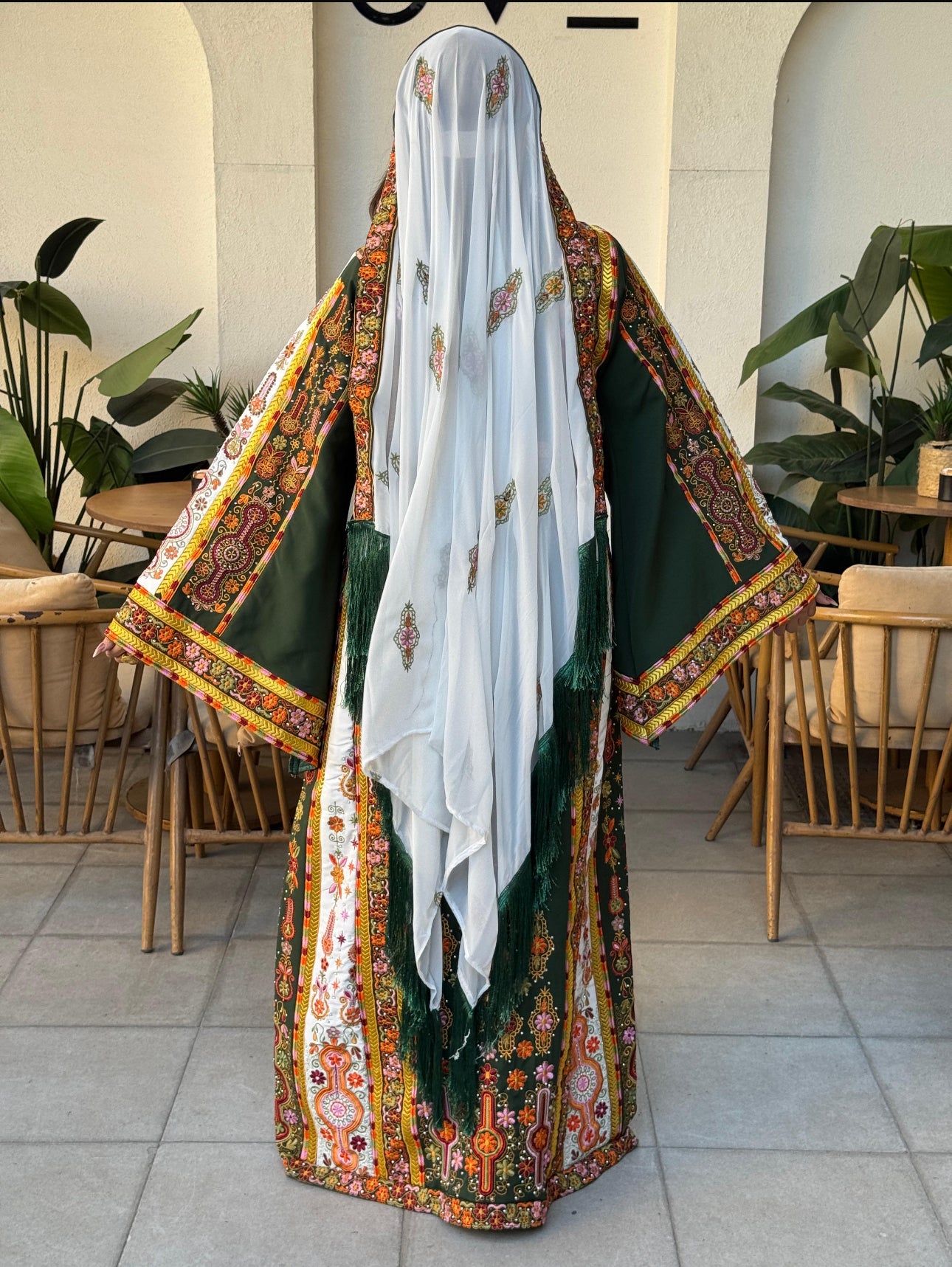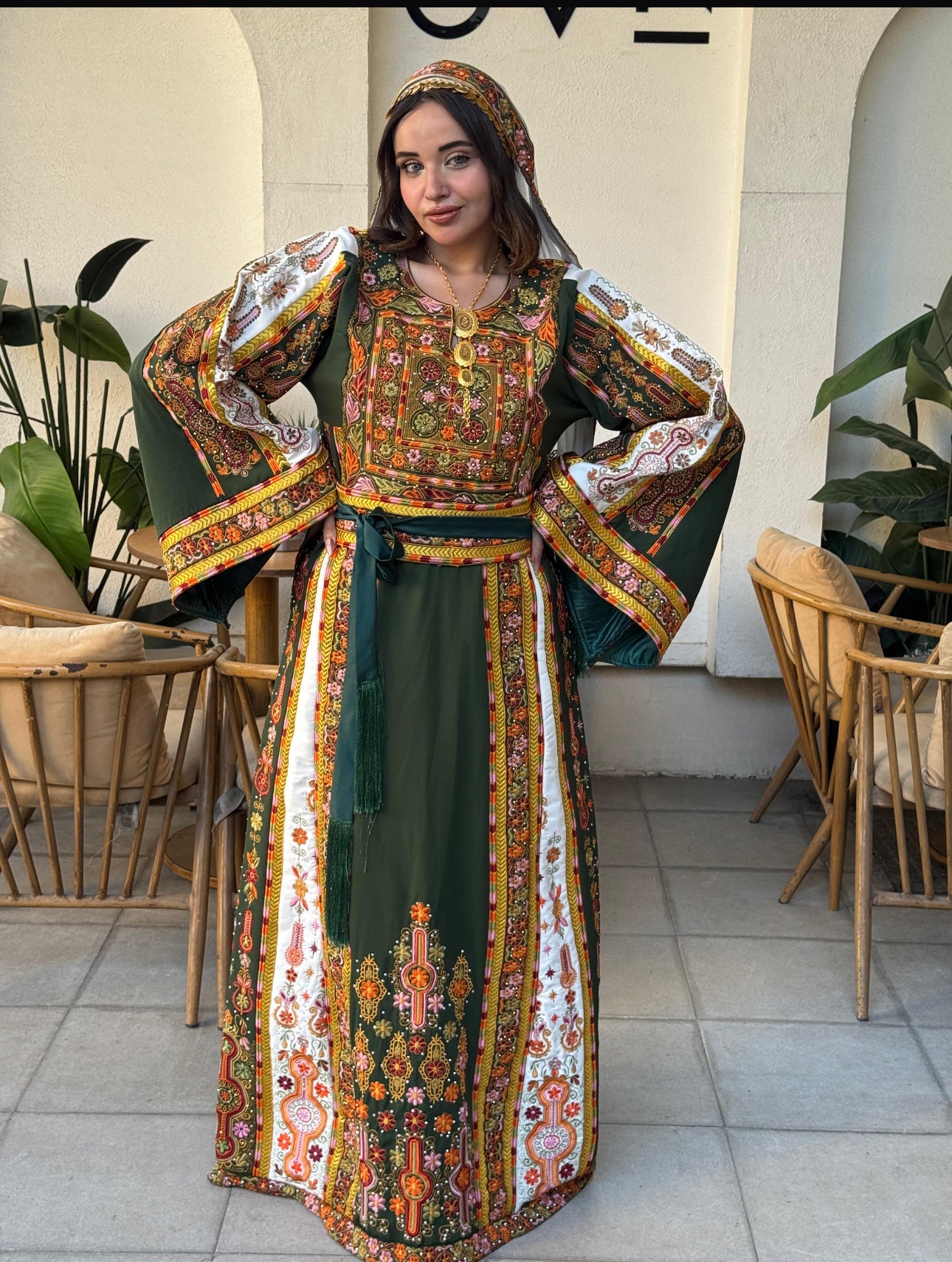Olive green fabric thobe , matching scarf and belt included.