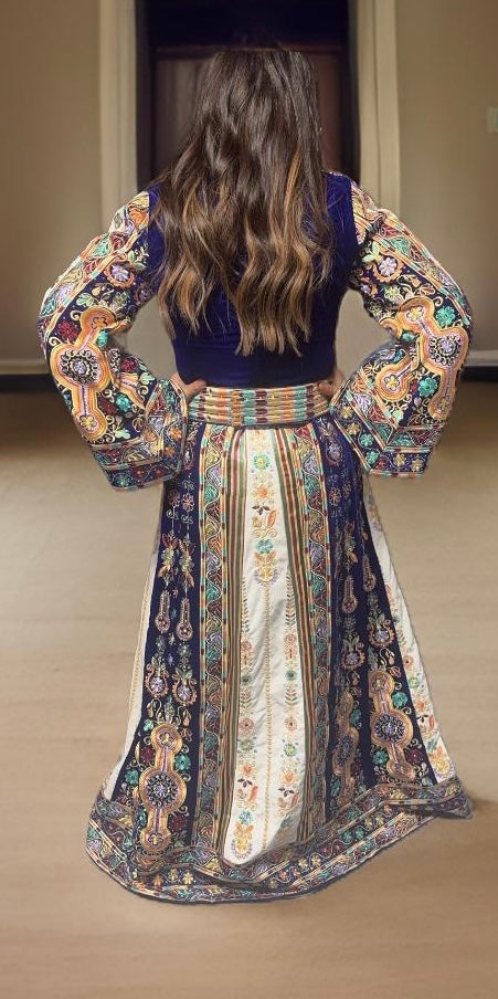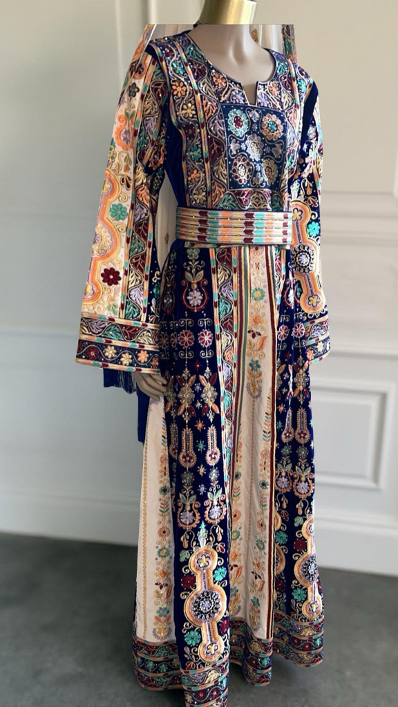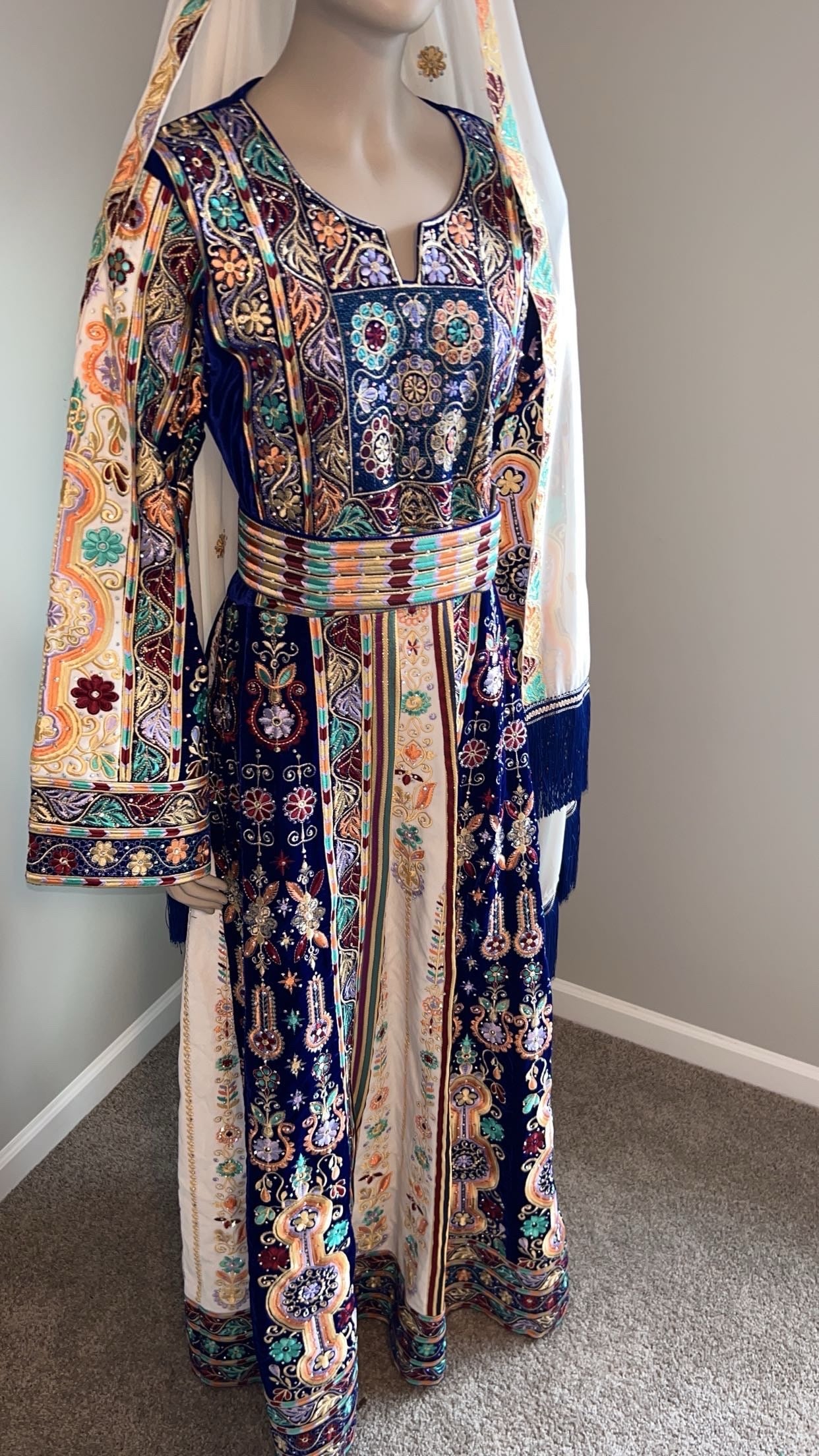 High quality off white and royal blue velvet Malkah outfit with belt and scarf included.