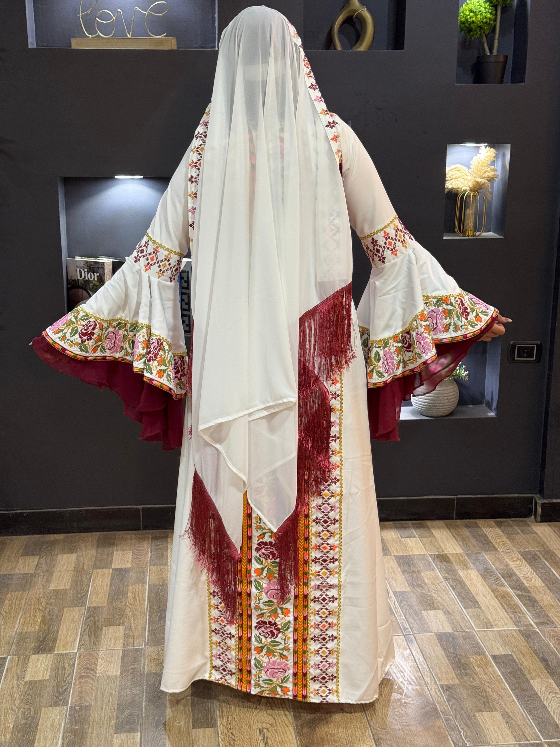 Lovely satin dress in white and burgundy, featuring embroidery on the front and back, with a matching belt and scarf included.