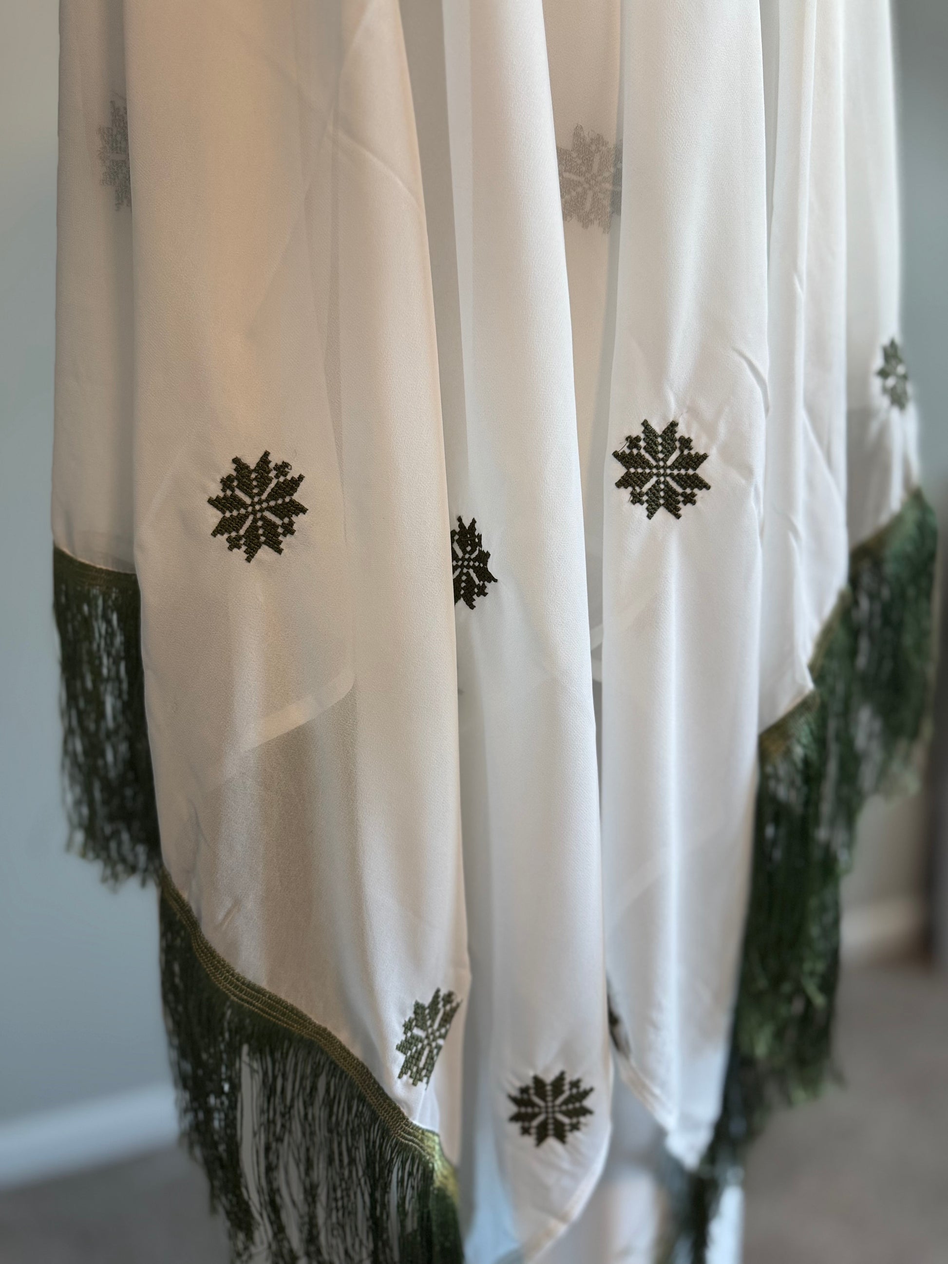 White headscarf with olive green embroidery and olive green hadab/sharabeesh. It measures 57 inches long and 28 inches wide. Delivery usually takes 3 to 4 days.